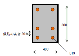 例えば、上図のように梁せいD=800で引張鉄筋の径がD19の場合を想定します。設計かぶり厚さ=40mmとすると、